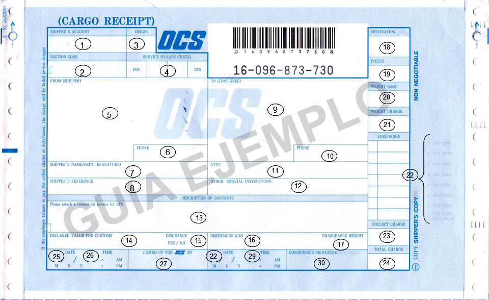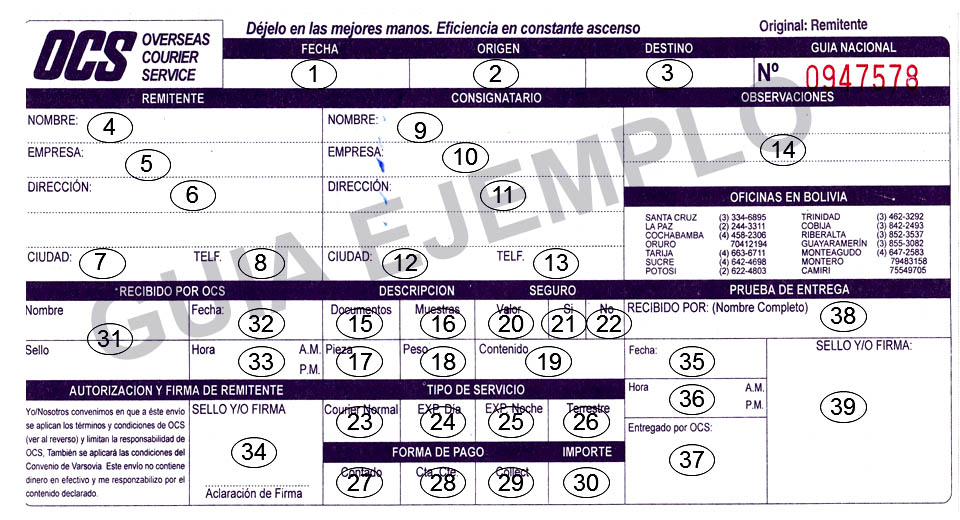 Para que su envío sea entregado en tiempo óptimo, es importante que esté debidamente rotulado y la guía OCS llenado en forma adecuada especificando los datos de: nombre, dirección y teléfono del destinatario en forma legible, de tal manera que no lleve a confusión o error y evitar demoras en la entrega.